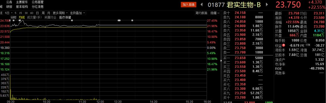 与大多数港股上市首日破发不同,君实生物-B的股价表现坚挺。开盘价23.5港元,大涨21.26%,最后收盘价为23.75港元,收涨22.55%,总交易额为4.31亿港元,这还是半天的交易额。(12月24日起香港迎来圣诞节假期,港股市场今日下午起休市)