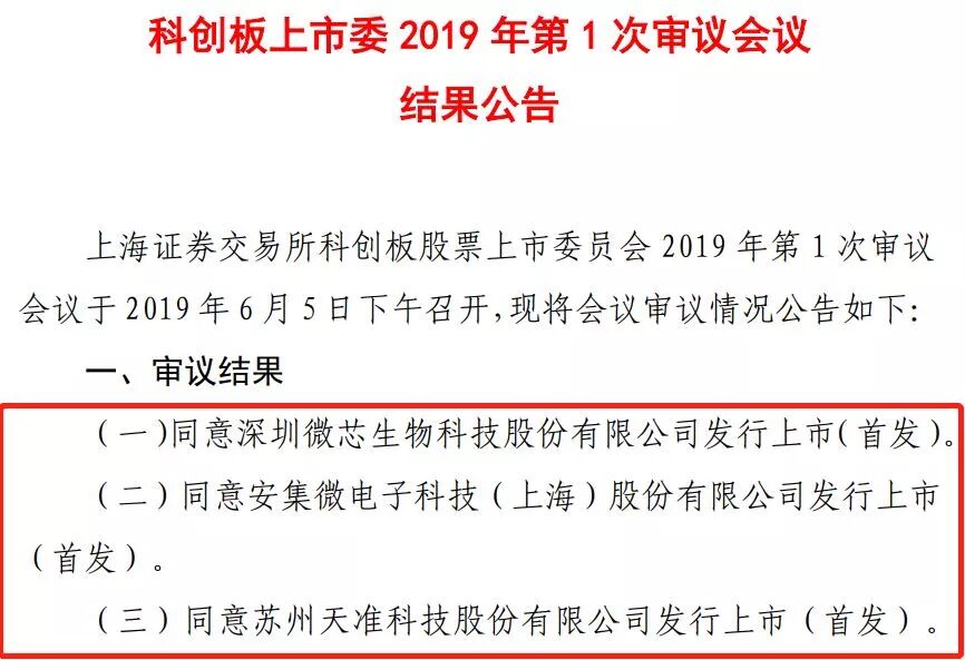 6月5日下午,科创板上市委召开第1次审议会议,刚刚结果出炉:3家企业“上会”,3家全部通过审核。 今日成功通过审核的3家企业分别为微芯生物、安集科技、天准科技,分别在创新药、高端半导体、人工智能技术方面拥有领先的地位,即将成为首批登陆科创板的企业。 根据制度安排,科创板的发行上市审核要经过受理、审核问询、上市委审议、证监会注册、发行上市等5个环节。 按照规定,科创板上市委形成同意发行上市的审议意见后,上交所将出具同意发行上市的审核意见,报送证监会履行注册程序。 至此,通过科创板第一次审议会议的3家“幸运儿”,距离注册及发行上市,仅一步之遥。 从科创板上市受理到“过会”,再一次见证了科创板速度。其中,天准科技用时最短,其受理时间为4月2日,上会时间是6月5日,仅用了64天。 值得注意的是,3家企业均不是第一批受理的9家企业,也就是说,科创板审议并非“先到先得”。 01 今日,科创板上市委提了这些问题 今日,科创板上市委第一次审议会议,可谓是万众瞩目,其对3家“上会”企业的问询问题,亦被市场重点关注。 针对微芯生物,上市委重点关注其未来业绩是否存在亏损的可能。 科创板上市委提出: 微芯生物,2016-2018年扣非后的归母净利润分别为502.60 万元、 1130.00 万元、1897.61 万元。 请结合 2019 年生产经营情况、未来产品开发和销售预计情况、研发项目和在建工程预计完成情况、深圳坪山生产基地用房土地使用权取得成本、代建成本预计情况等,说明发行人未来是否存在亏损的较大可能性 ? 在针对安集科技的审议中,上市委直指其大部分研发投入用于折旧与摊销,且截至 2018 年 12 月 31日,安集科技及其子公司拥有授权发明专利190 项,但均为 2014年及之前取得。 上交所要求其进一步说明: 研发费用中的折旧摊销占公司总折旧摊销金额比较高的合理性?是否存在将实际生产用设备折旧计入研发费用,从而导致毛利率虚高的情形? 研发费用的加计扣除数与实际归集的研发费用存在较大差异的原因及合理性。 最后,针对天准科技,科创板上市委的问题亦直戳重点:对苹果公司的依赖。 据招股书显示,天准科技一大客户为苹果公司,其主要为苹果提供智能检测装备。2018年,来源于苹果的直接收入占当期营收比例高达28.51%。 今日,上市委在审核会议中重点要求其说明: 获得苹果公司及其供应商订单的稳定性,是否存在对发行人产品的需求上限? 玻璃及其他结构件检测装备是否存在其他供应商,产品是否存在被替代的风险,上述产品的后续研发能力。 02 3家过会企业关键词:创新药、高端半导体、人工智能 微芯生物:55%的营收投入研发 微芯生物,成立于2001年,专注于肿瘤、代谢疾病和免疫性疾病三大治疗领域的原创新药研发,旗下产品包括已经正式上市销售的新药西达本胺、创新药西格列他纳等。 此次科创板IPO拟募资8.04亿元,用于创新药研发中心和区域总部项目等项目。此次选择了“标准一”为其上市标准: 预计市值不低于10亿元,最近两年净利润均为正且累计净利润不低于5,000 万元,或者预计市值不低于10 亿元,最近一年净利润为 正且营业收入不低于1 亿元。 招股书显示,2016年至2018年,微芯生物营业收入分别为8536.44万元、1.11亿元和1.48亿元;近两年扣非后净利润均超过1000万元。 值得一提的是,其近三年研发投入占营业收入比例均在55%以上,该比例系117家科创板受理企业中的最高值。 安集科技:芯片关键材料厂商 安集科技,是上海第二家申请科创板上市获受理的公司,其主营业务为关键半导体材料的研发和产业化。目前其产品包括不同系列的化学机械抛光液和光刻胶去除剂,主要应用于集成电路制造和先进封装领域。 自2018年10月开始接受IPO辅导后,安集科技于2019年3月29日正式转战科创板。 据其上会稿,此次科创板IPO拟募资3.03亿元,用于抛光液生产线扩建等项目。 2016年至2018年,其核心技术产品化学机械抛光液和光刻胶去除剂收入占营收比例均超过99%,为其主要收入来源。同期,其营收规模超过2亿元、扣非后净利润在4000万元左右。 近3年,安集科技的研发投入占营业收入的比例均在21%左右。 天准科技,28%的营收来自苹果 天准科技成立于2009年,主要以机器视觉为核心技术,专注服务于工业领域客户,主要产品为工业视觉装备,包括精密测量仪器、智能检测装备、智能制造系统、无人物流车等。 天准科技采取的上市标准为科创板第三套标准,即预计市值不低于20亿元,最近一年营业收入不低于3亿元,且最近三年经营性的现金流量净额累计不低于1亿元,是科创板首家采取“标准三”企业。 此次计划募资合计10亿元,其中4.75亿元用于机器视觉与智能制造装备建设,2.75亿元投资研发基地建设项目,其余2.5亿元用于补充公司流动资金。 值得一提的是,天准科技一大客户为苹果公司,其主要为苹果提供智能检测装备。2018年,来源于苹果的直接收入占当期营收比例高达28.51%。 截至目前,天准科技拥有63项专利授权,其中包括33项发明专利。研发技术人员286人,占总员工人数约三成。而其近三年的研发费用率呈现下滑趋势,2018年为15.66%。 03 3家过会企业,影子股全梳理 3家企业成功夺得“科创板第一股”,大概率将被市场追捧,但距离登陆科创板上市,尚且还有一段距离。 而对于A股投资者来说,,首批“过会”的3家科创板企业的相关影子股,值得重